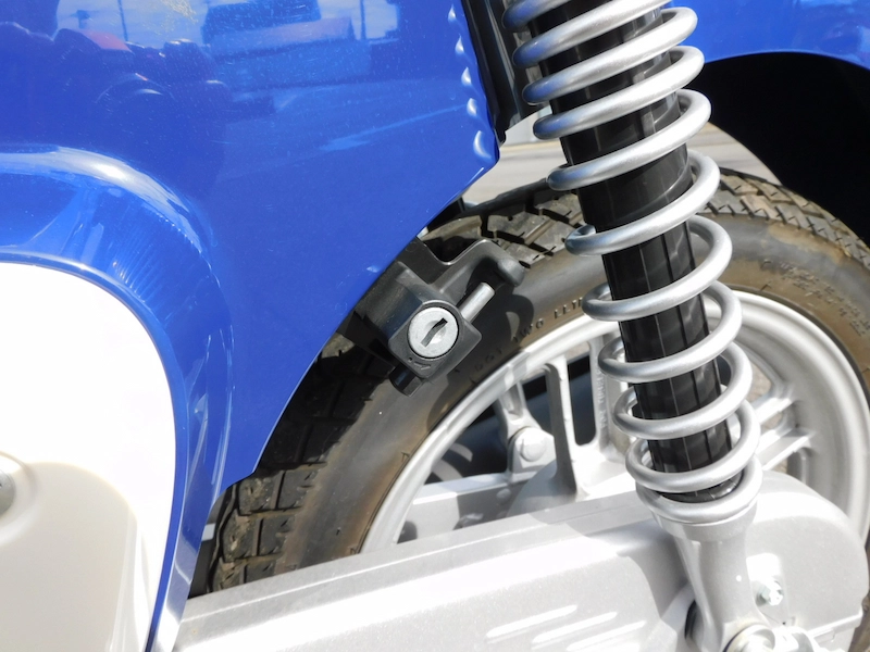 フロントはディスクブレーキとABSを装備しホイールは前後14インチのキャストホイールとチューブレスタイヤを装備してます。緩やかな坂道でも駐車できる後輪ロックやLEDヘッドライト、ギアポジションインジケーターなどが標準装備されています。
