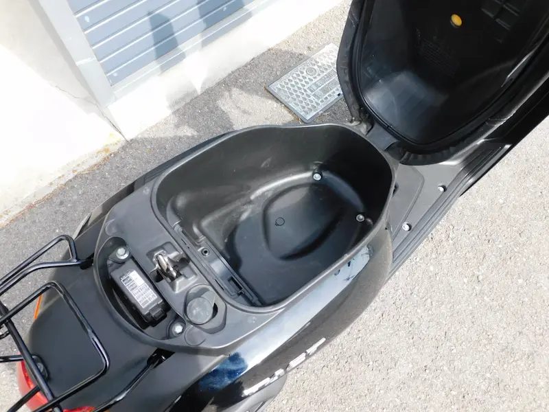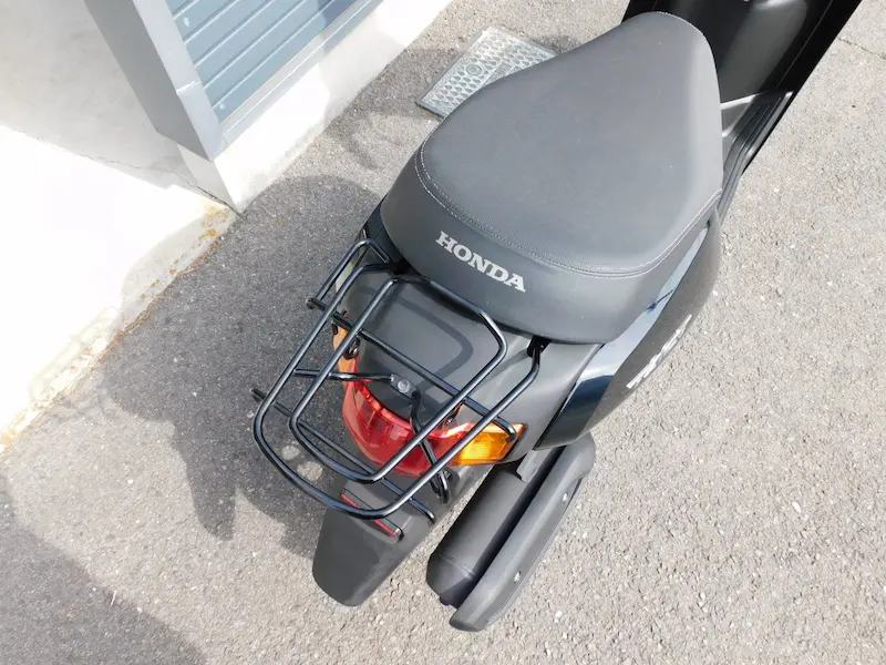 ハンドル下部にはカバンホルダーとフロントポケット、シート下には容量約20リットルの収納スペース、シート後方にはリアキャリアが標準で装備されてますので、お買い物用としてもご利用いただけると思います。リアキャリアは持ち手も付いており、センタースタンドを出すときのグリップの役目も兼ねてます。