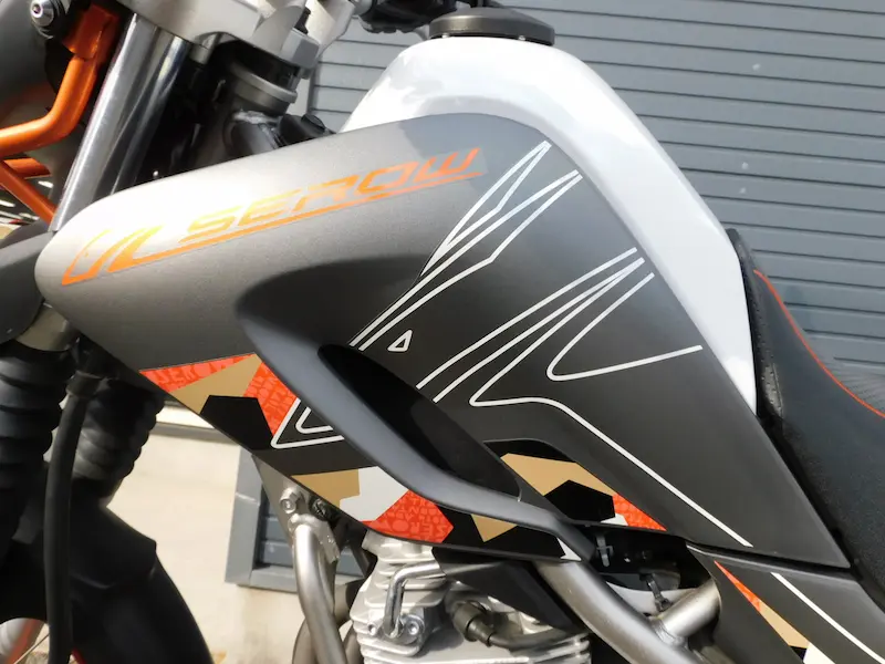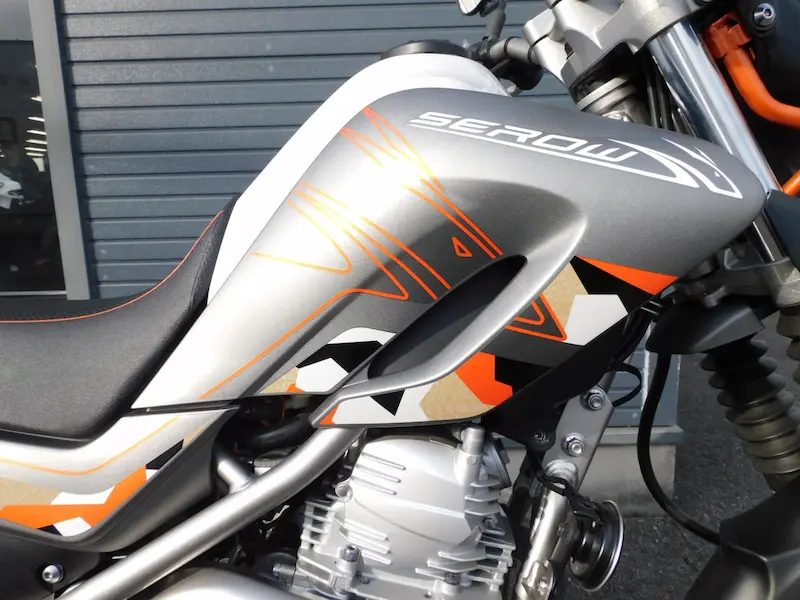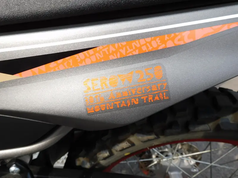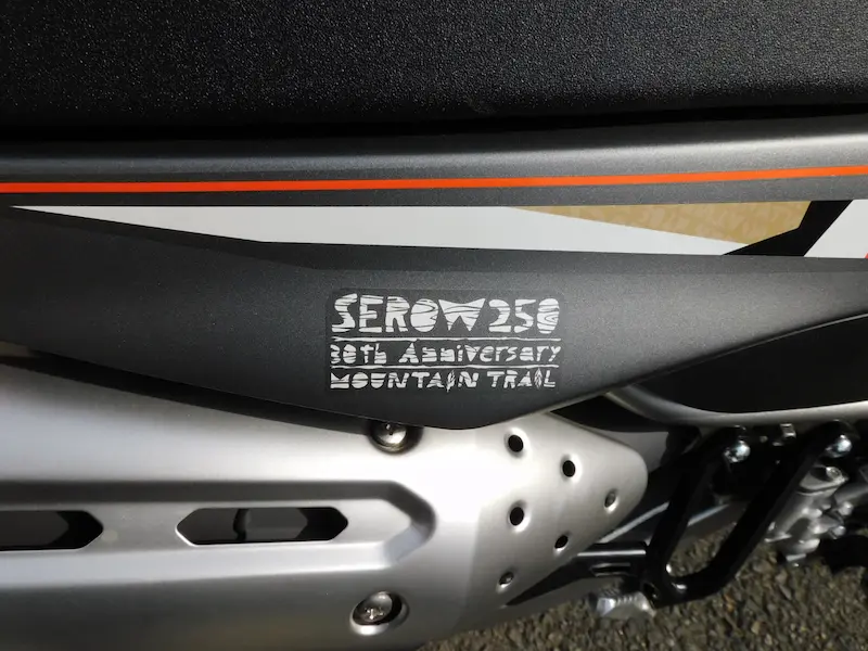 右側のタンクシュラウドはオレンジでカモシカがデザインされてます。サイドカウルにはホワイトの「SEROW250 30th Anniversary MOUNTAIN TRAIL」ロゴが入ってます。