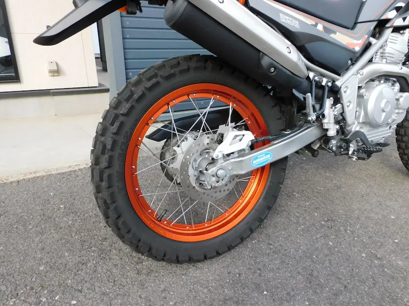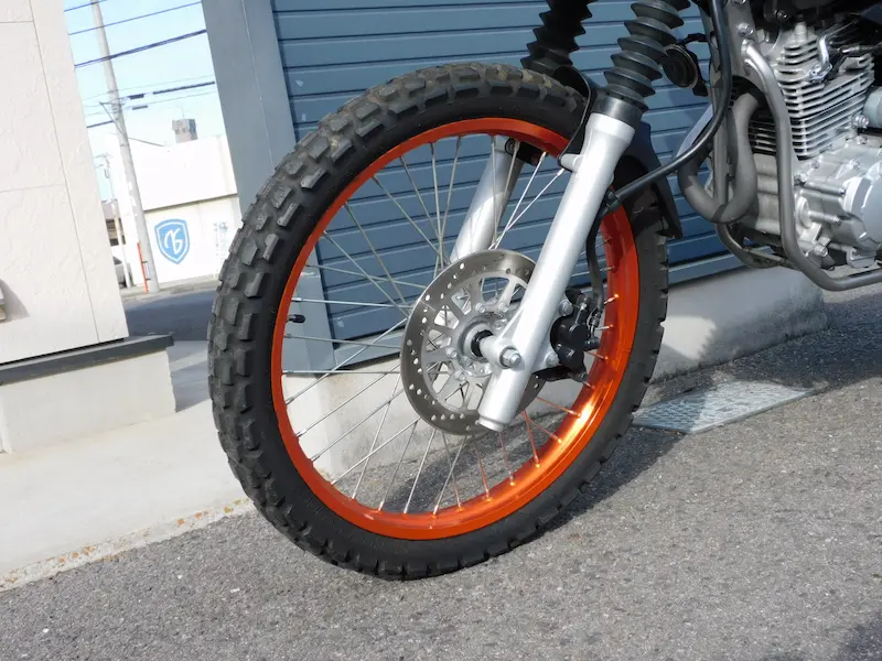 フロントホイールは21インチのチューブタイプ、リヤホイールは18インチのチューブレスタイプになります。